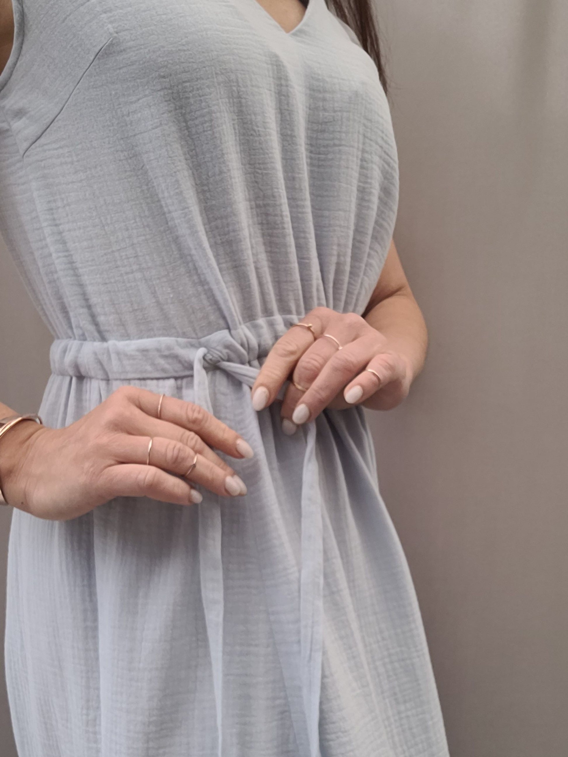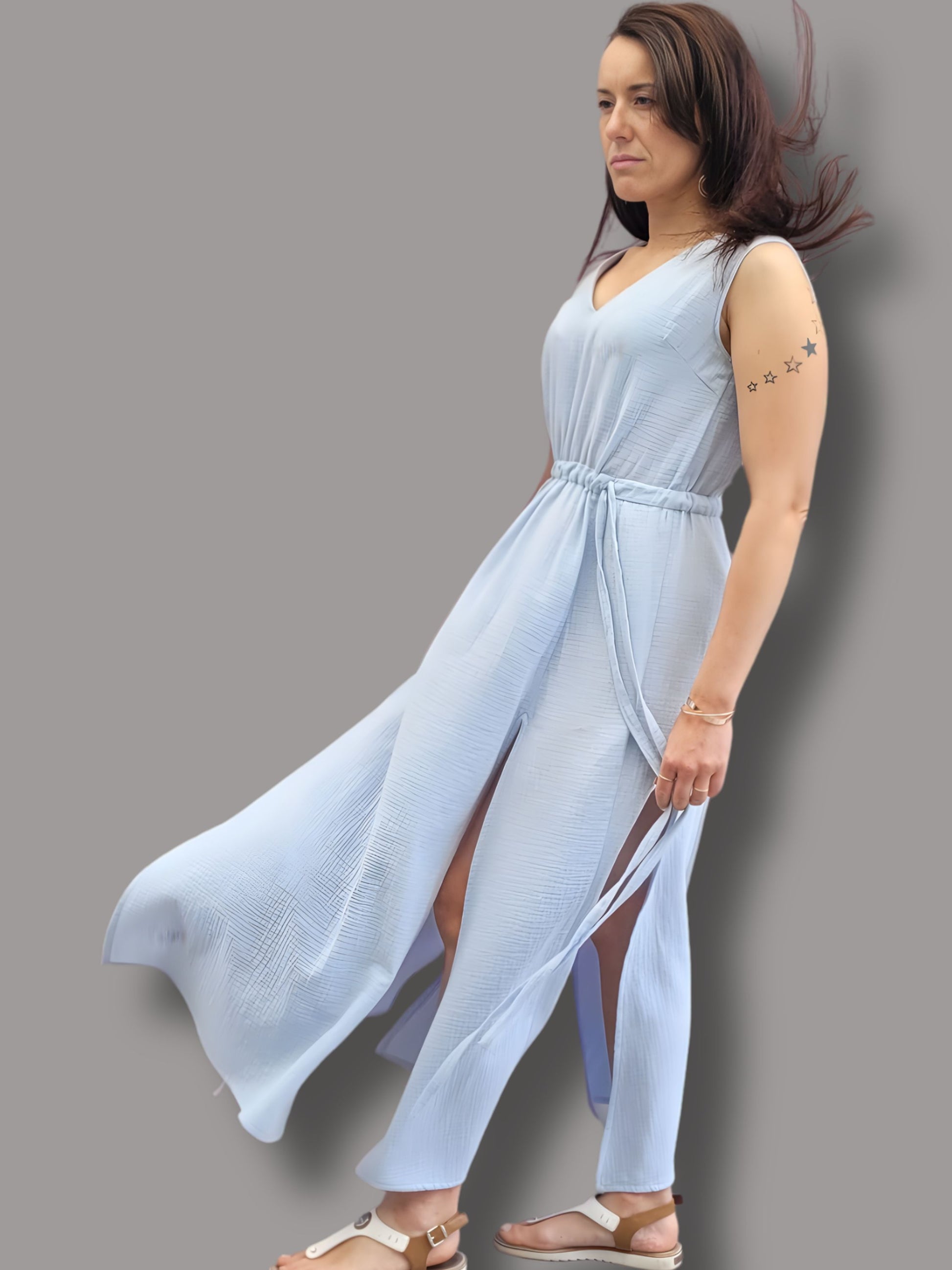 Dieses Schnittmuster bietet eine Vorlage für ein elegantes, ärmelloses Kleid mit lockerer Passform und einem V-Ausschnitt vorne sowie am Rücken. Sowohl der Hals- als auch der Armausschnitt sind mit einem durchgehenden Beleg versehen. Für eine optimale Passform sind Brustabnäher im Oberteil eingearbeitet. An der Taille befindet sich ein Tunnelzug, der die Weite des Kleides individuell einstellbar macht. Zwei Kordeln, die durch die Öffnungen an der Taille geführt werden, ermöglichen die Regulierung der Taillenweite. Der lange Rock des Kleides ist weit geschnitten und verfügt über jeweils zwei Schlitze an den Seiten vorne und hinten, die dem Design eine zusätzliche Leichtigkeit und Bewegungsfreiheit verleihen.